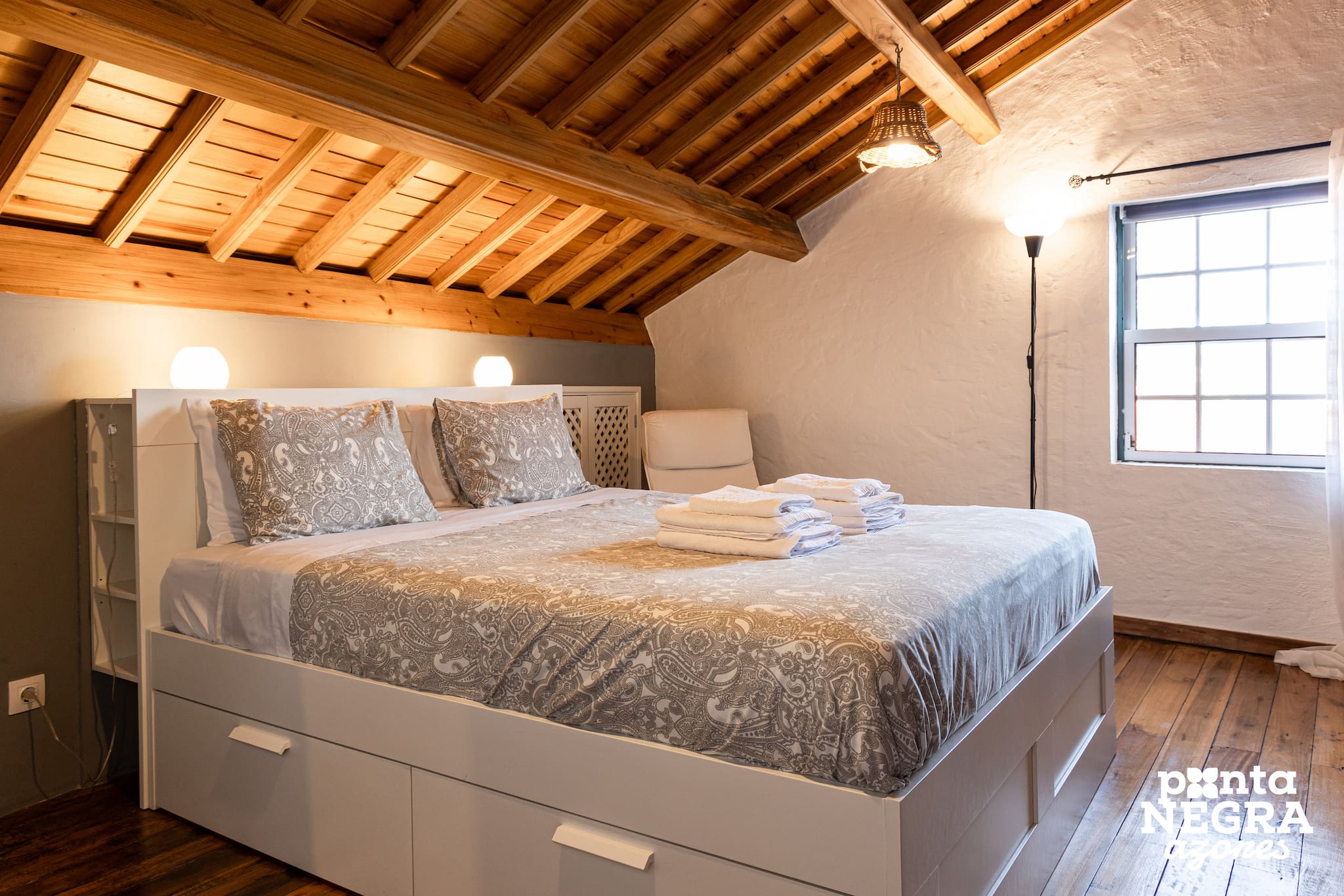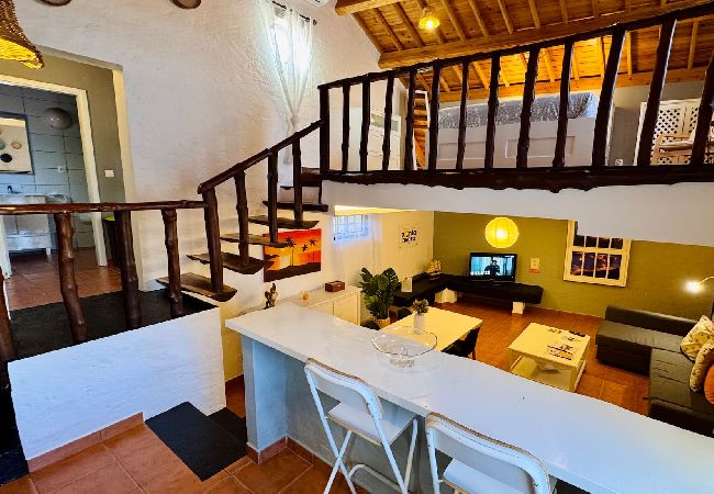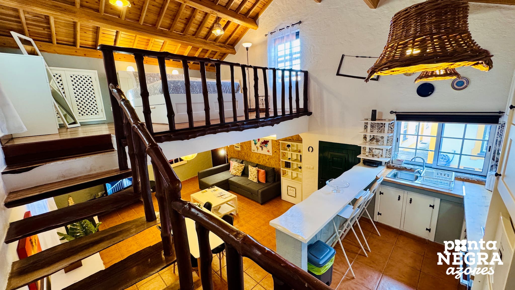 O alojamento apresenta um conceito de dois níveis (mezanino), onde o piso inferior alberga a sala de estar, equipada com um sofá-cama muito confortável, televisão de ecrã plano e uma área de relaxamento. No piso superior, no mezanino, localiza-se o quarto com uma cama de casal, criando um ambiente íntimo e bem definido entre as áreas de descanso e de estar.