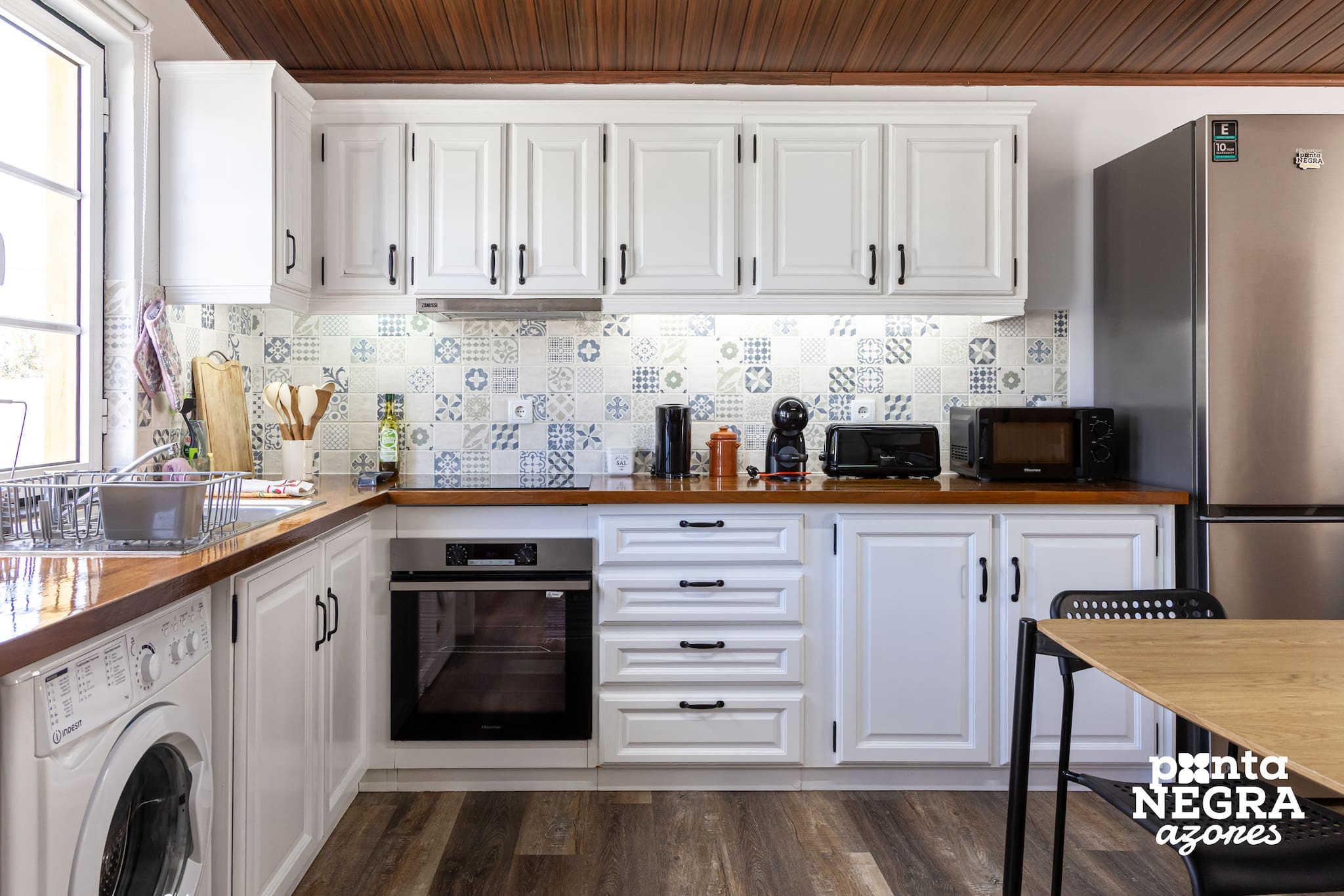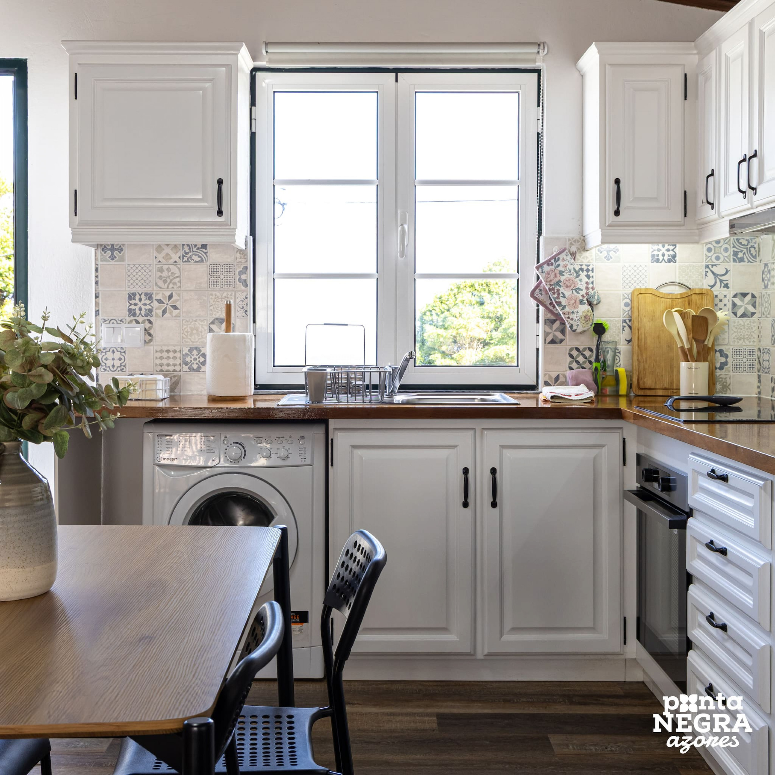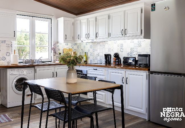 A cozinha está totalmente equipada, permitindo preparar refeições de forma prática, enquanto desfruta do ambiente tranquilo do alojamento.