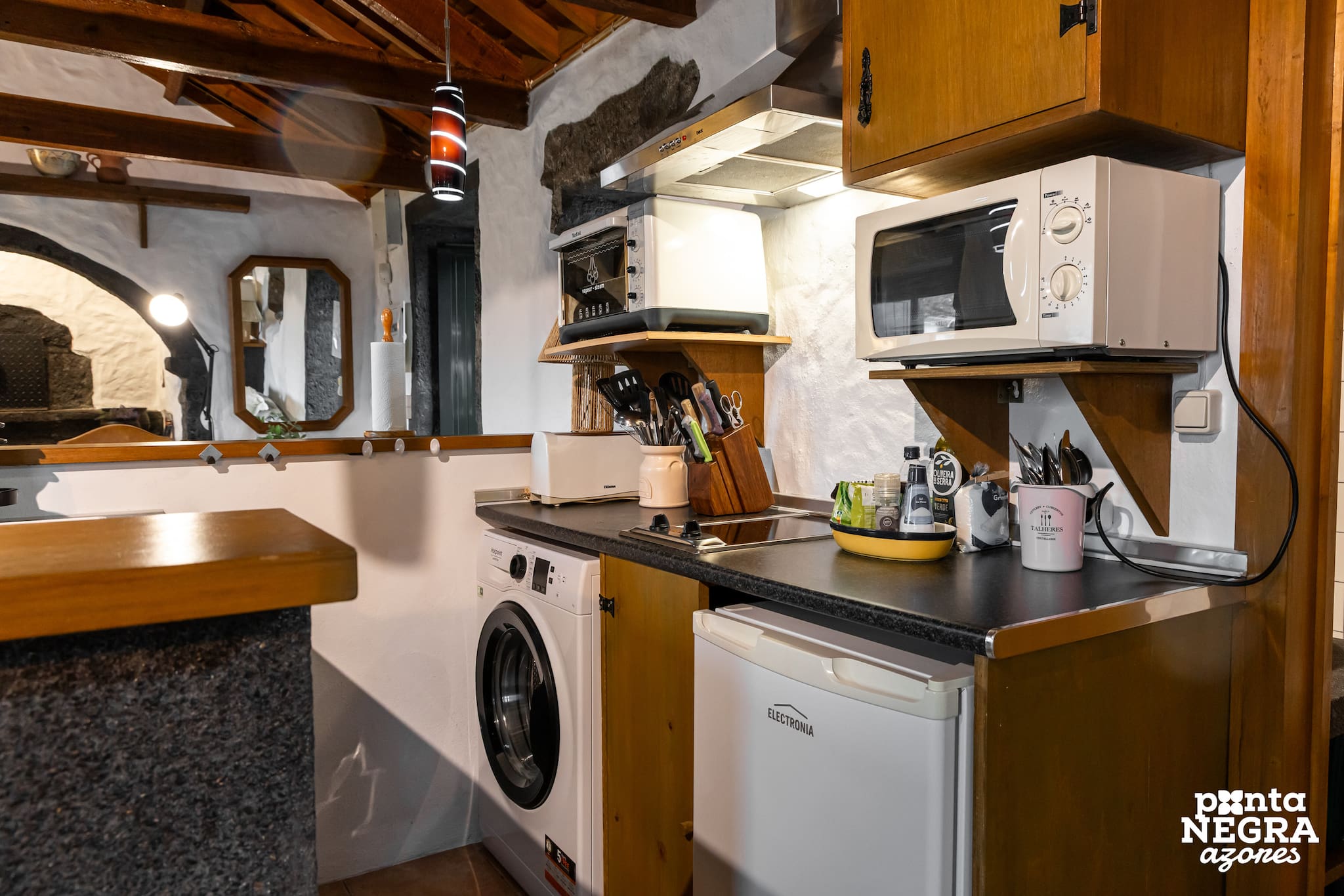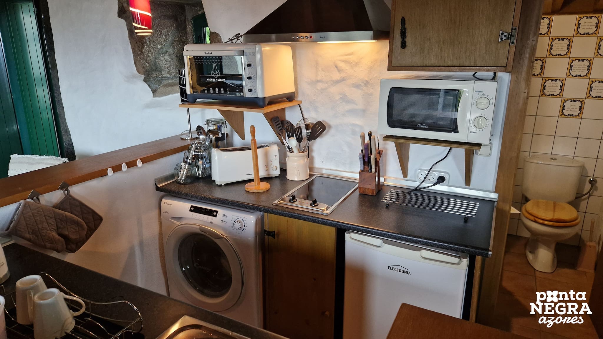 A cozinha encontra-se totalmente equipada, permitindo preparar as suas refeições com comodidade, seja para um pequeno-almoço tranquilo ou um jantar ao final do dia.