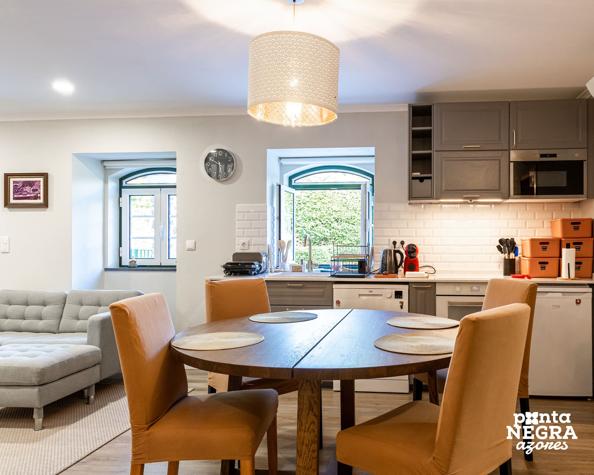 A cozinha em espaço aberto é totalmente equipada e partilhada com outros hóspedes, permitindo a preparação de refeições simples de forma prática. A sala de estar, igualmente partilhada, oferece um ambiente confortável e agradável para relaxar ou socializar.
